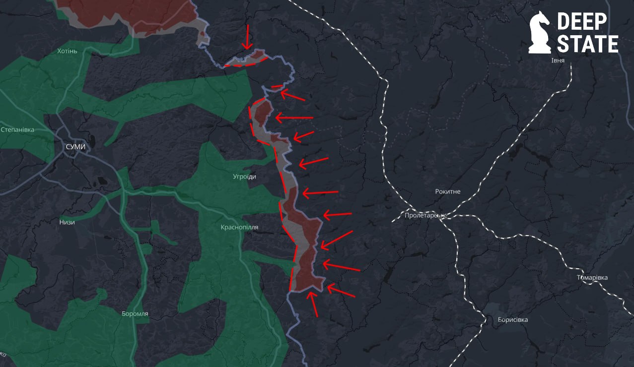 На сьогоднішній день новоутворена площа контролю та інфільтрації противника (червона та сіра зони) вздовж кордону на Сумщині складає близько 150 км2. Сили Оборони знають про плани противника, слідкують за розвитком подій та намагаються протидіяти розповсюдженню контролю", - повідомляє аналітичний проект DeepState 14 квітня.