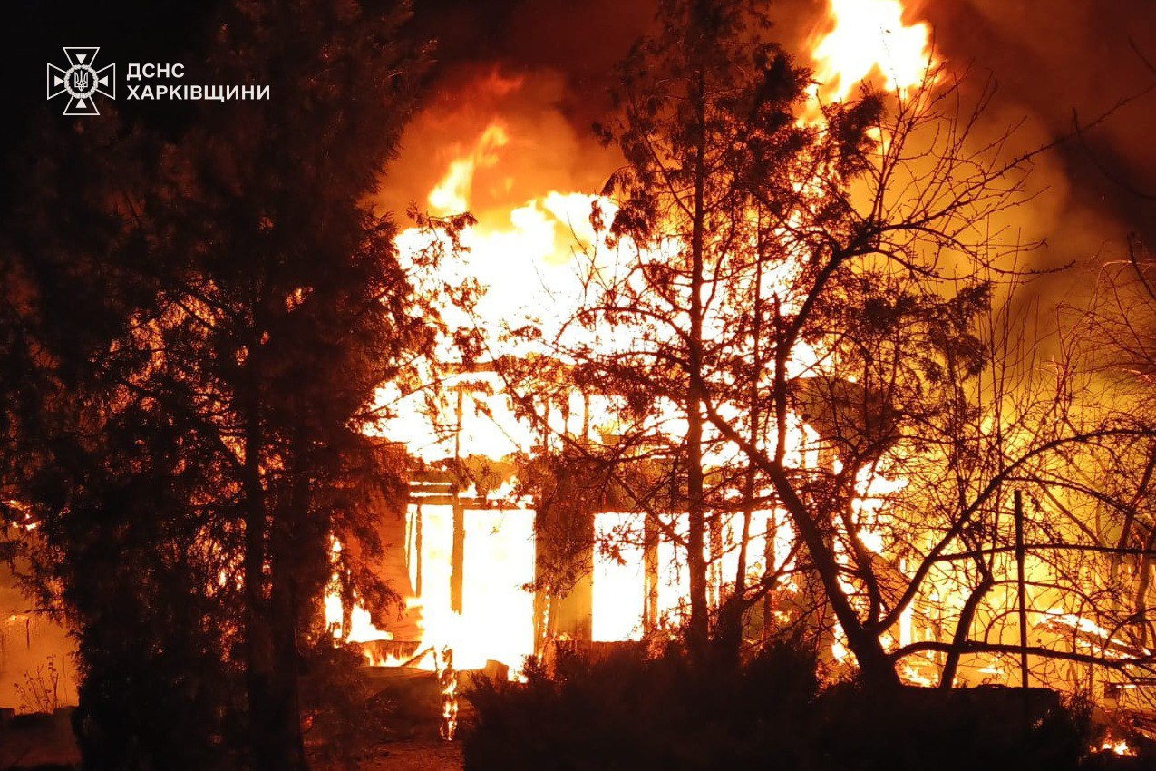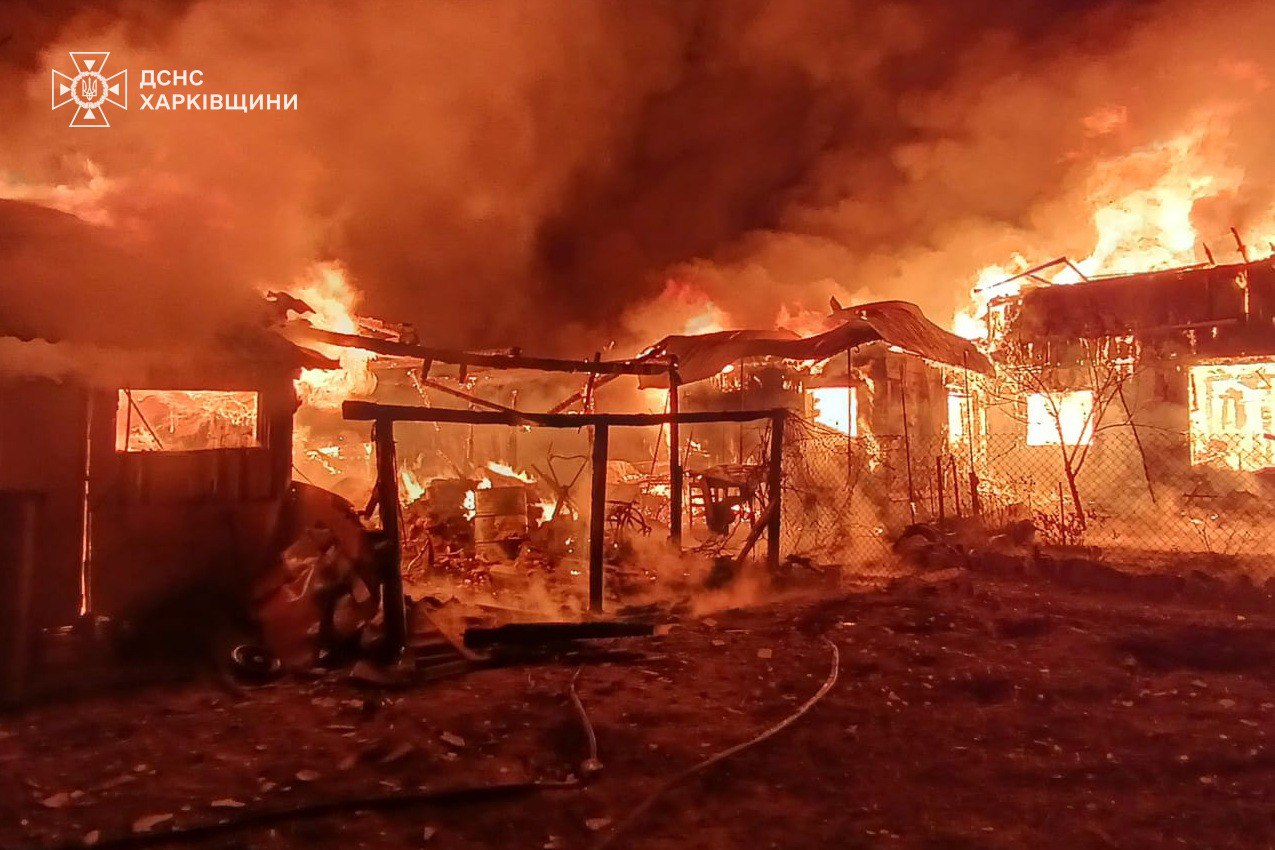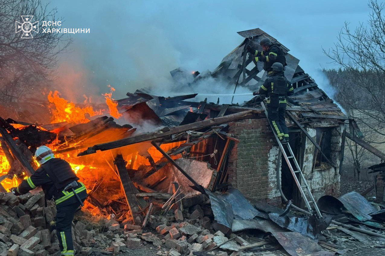 Російські окупанти продовжують знищувати бомбами села на Харківщині. На фото ДСНС - зруйновані та палаючі будинки у селі Новоселівка Богодухівського району та селі Підлиман Ізюмського району.