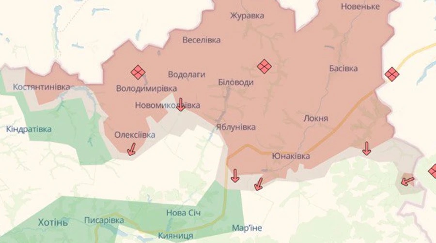 "Ворог має просування поблизу села Юнаківка Юнаківської сільської громади Сумського району Сумської області, а також біля села Свято-Покровське Сіверської міської громади Бахмутського району Донецької області", - повідомляє аналітичний проєкт DeepState.