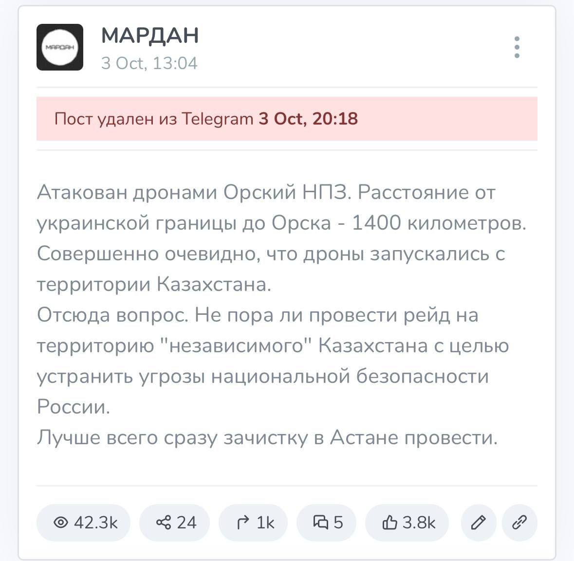 Ведучий проекту «Соловйов Live» Сергій Мардан вважає, що дрони, які атакували російський Орськ, були запущені з території Казахстану, тому він пропонує провести «рейд» на території цієї країни. За його словами, Орський НПЗ зазнав атаки дронів, а відстань від українського кордону до Орська становить 1400 кілометрів. «Цілком очевидно, що дрони запускалися з території Казахстану. Звідси питання. Чи не час провести рейд на територію «незалежного» Казахстану з метою усунути загрози національній безпеці Росії? Найкраще відразу провести зачистку в Астані», — написав він у Telegram, який наступного дня видалив. Як повідомлялося, 3 жовтня у місті Орськ Оренбурзької області РФ відбулася атака з використанням безпілотних літальних апаратів (БПЛА). За даними українських медіа, метою ударів стало підприємство «Орскнафтооргсинтез».