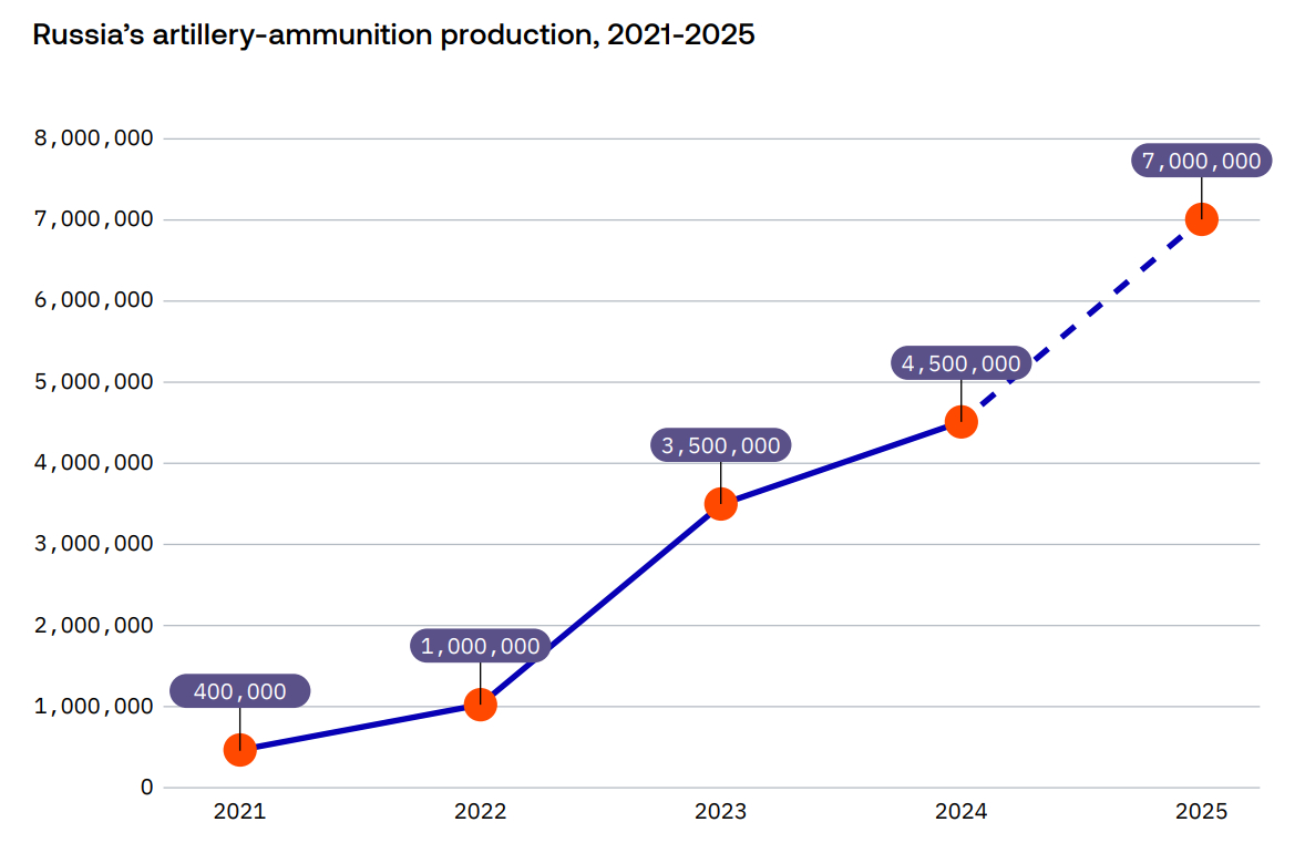 За оцінками естонської спецслужби, у 2025 році російські заводи виробили понад 7 мільйонів снарядів, мінометних мін і ракет, порівняно з 4,5 мільйона у 2024 році. Про це йдеться у звіті розвідки Естонії за 2026 рік, - пише УП.