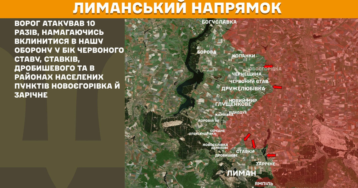 Як йдеться в оперативній інформації Генштабу ЗСУ станом на 8:00 19 грудня, на Лиманському напрямку ворог атакував 10 разів, намагаючись вклинитися в нашу оборону у бік Червоного Ставу, Ставків, Дробишевого та в районах населених пунктів Новоєгорівка й Зарічне.