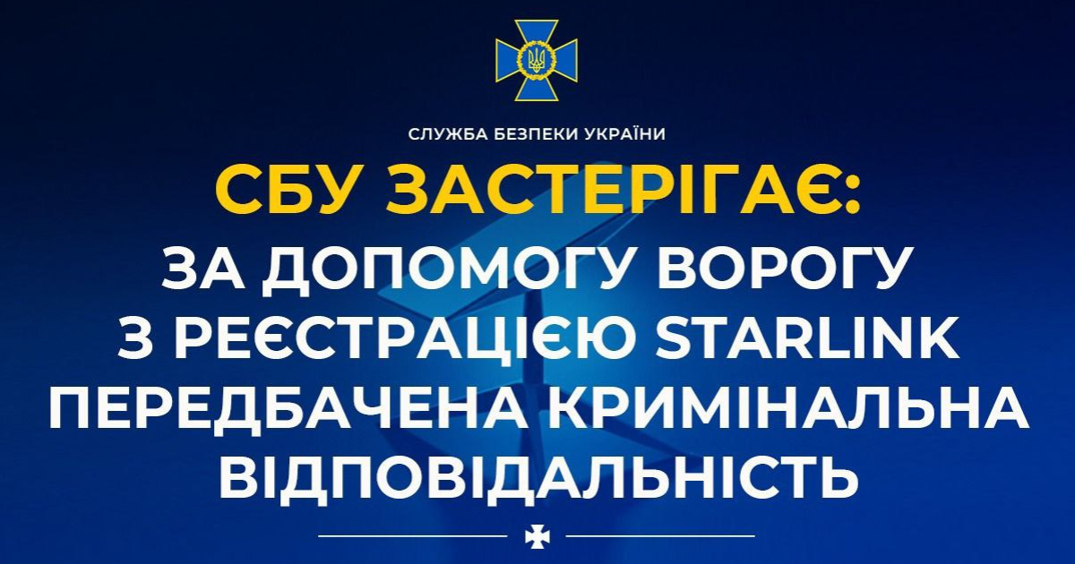 "Ворог намагається завербувати українців для реєстрації російських терміналів Starlink. СБУ застерігає: за це передбачена кримінальна відповідальність. Служба безпеки України активно протидіє спробам РФ завербувати українців для незаконної реєстрації систем Starlink", - повідомили в Телеграм-каналі СБУ 12 лютого.
