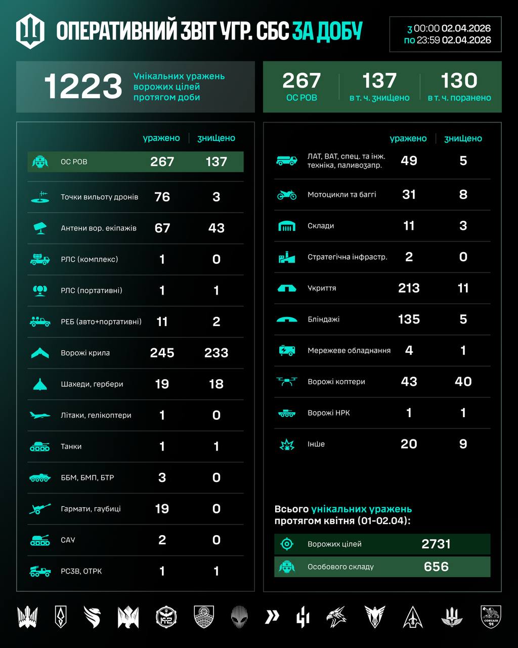 "Загалом упродовж квітня (01-02.04) підрозділами СБС уражено 2731 ціль противника, з них 656 – особовий склад", – повідомили СБС.