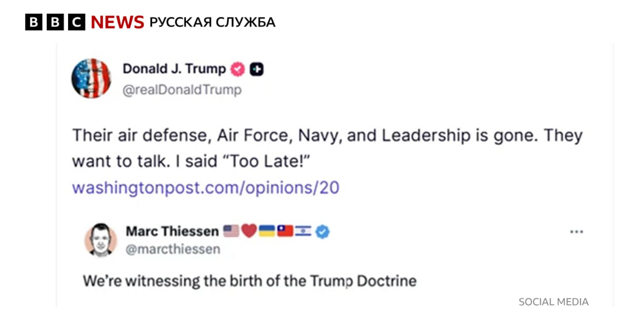 "Їх протиповітряної оборони, повітряних сил, флоту та керівництва більше немає. Вони хочуть переговорів. Я відповів: пізно!", - написав Трамп у своїй мережі TruthSocial.