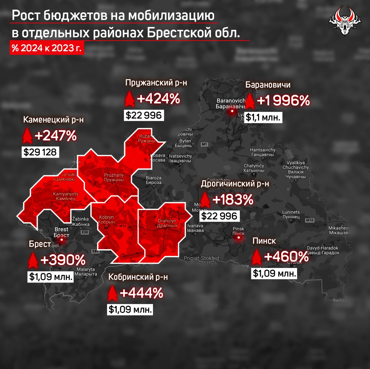 "Загальна сума видатків на національну оборону і мобілізацію всіх бюджетів Брестської обл. у 2024 р. становила ≈ $4,89 млн. Це в 4,7 раза більше, ніж у 2023-му. Найбільші витрати за статтею "Національна оборона. Забезпечення мобілізаційної підготовки та мобілізації" заплановані в Бресті, Барановичах, Пінську та Кобринському р-ні. На ці бюджети припадає 90% видатків усієї області", - ідеться в повідомленні.