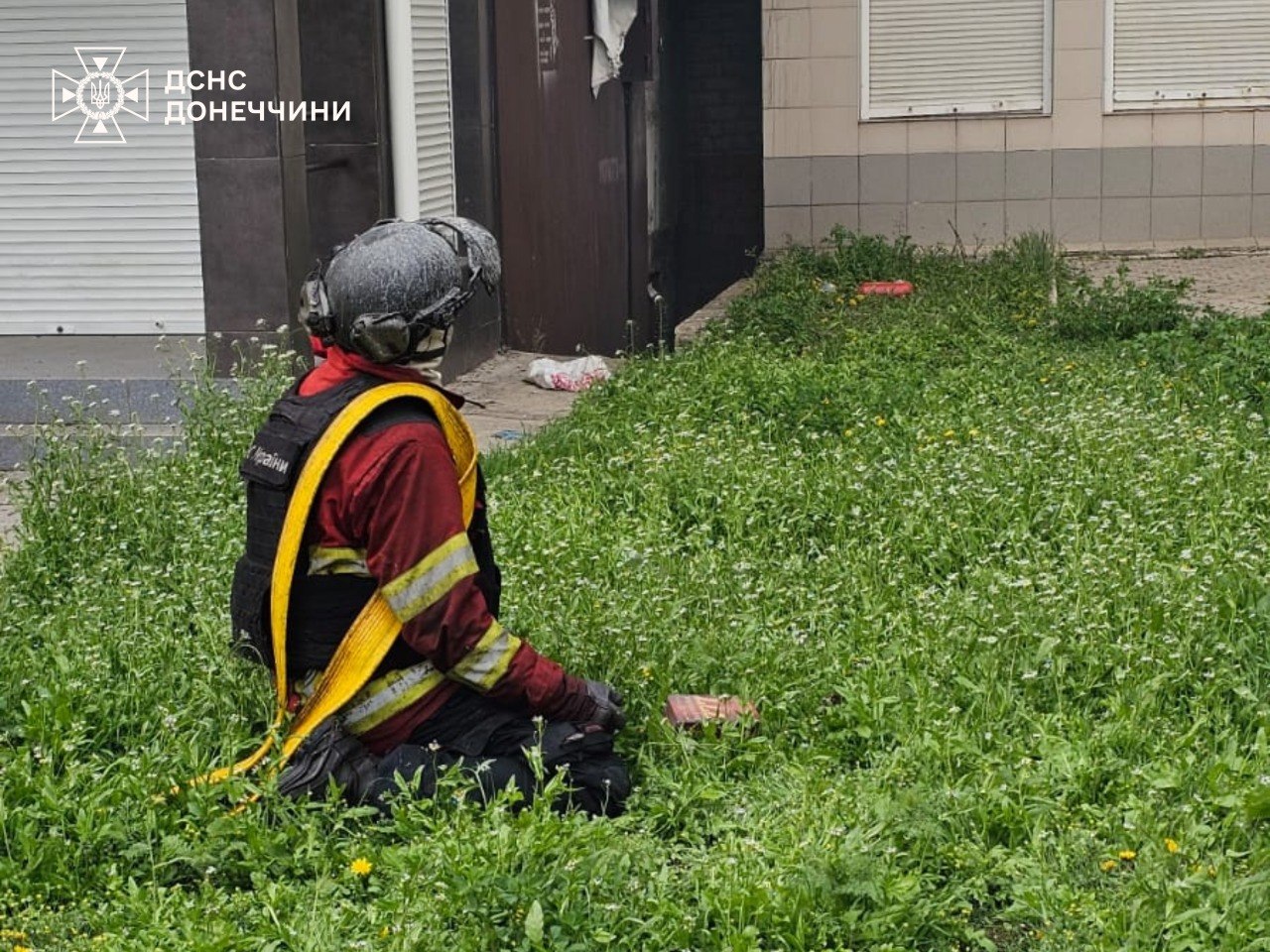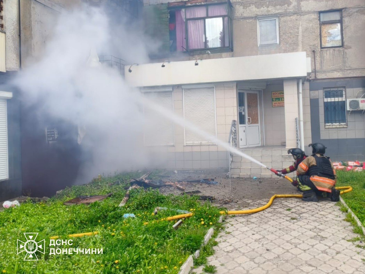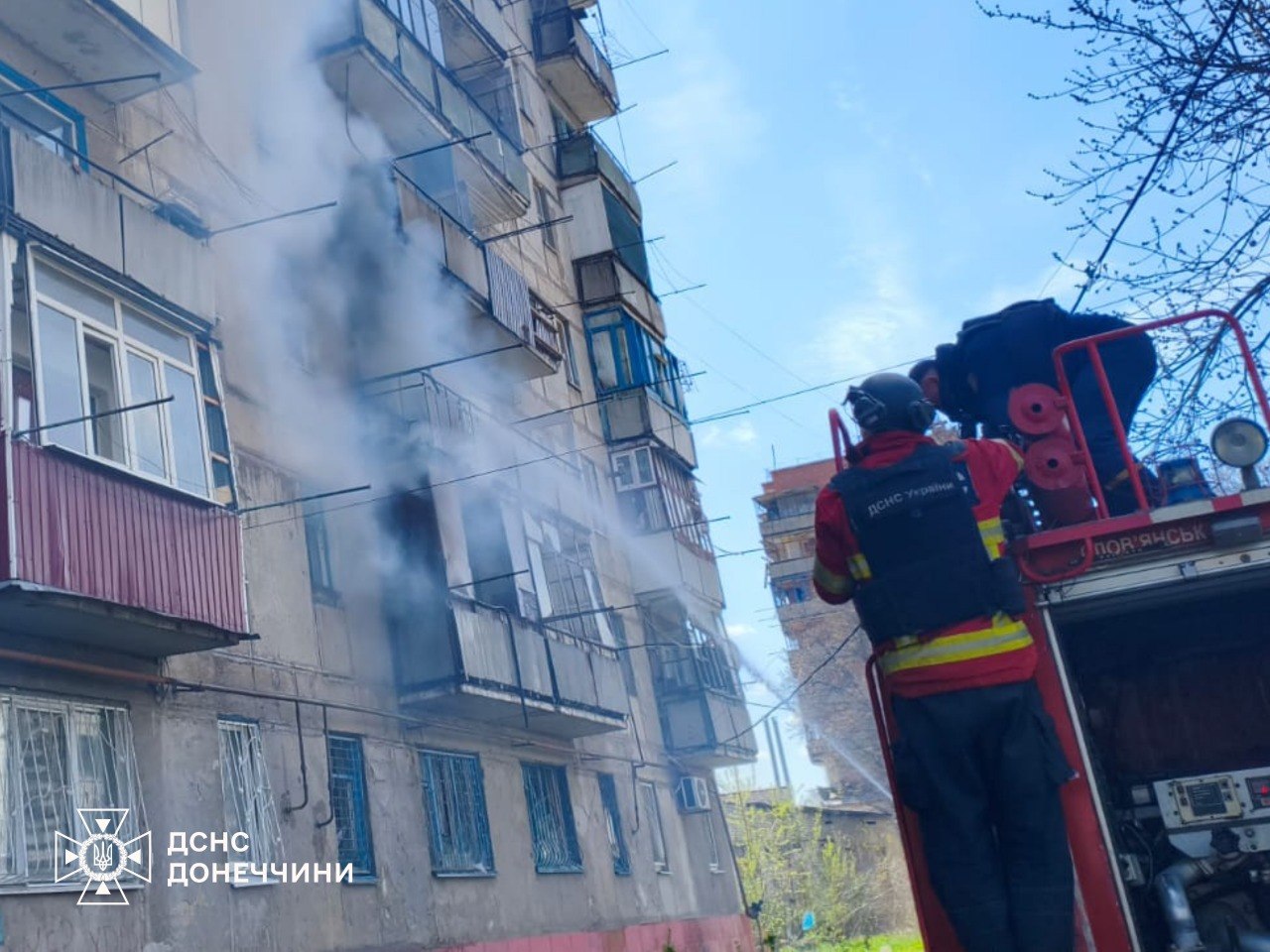 "Сьогодні посеред дня російський агресор атакував житлову девятиповерхівку ударними дронами. Виникли пожежі в помешканях з 2-го по 9-ий поверхи. На місці події вогнеборці врятували жінку та чоловіка з квартири на 2-му поверсі, які через сильне задимлення не мали змоги самостійно залишити приміщення", - повідомляє ДСНС Донеччини 23 квітня.