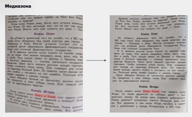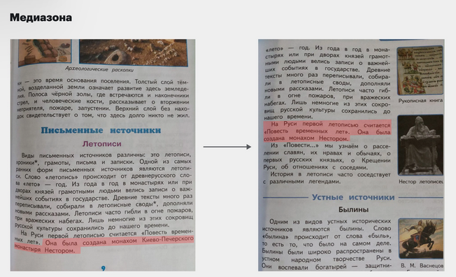 Видання ознайомилося з кількома сторінками відредагованого підручника та порівняло їх із версією 2021 року. Наприклад, якщо в старому виданні йшлося про те, що літопис "Повість минулих літ" написав монах Києво-Печерського монастиря Нестор, то в новій версії Нестора названо просто ченцем, без уточнення місця, де він жив і працював.