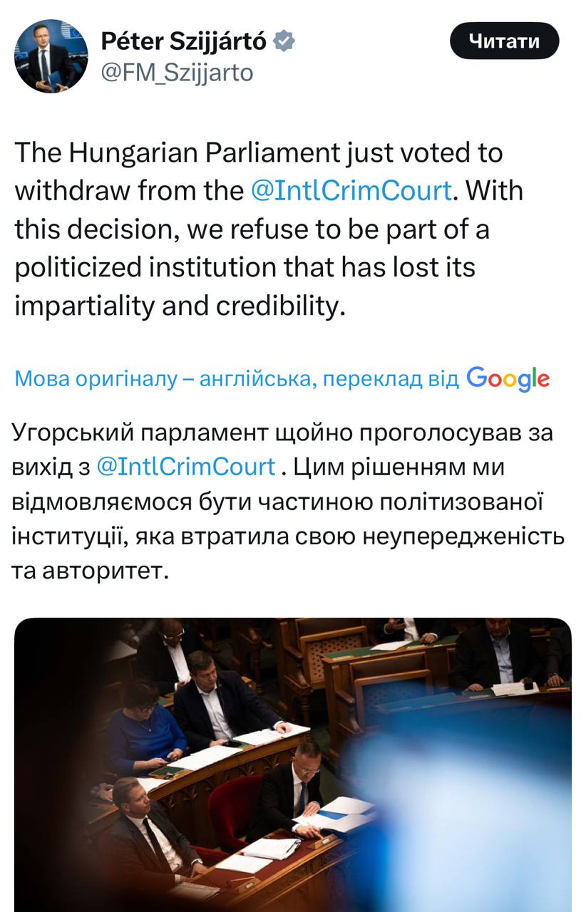 Парламент країни проголосував за вихід з МКС. Про це повідомив угорський міністр закордонних справ Петер Сійярто у соцмережі Х 29 квітня.