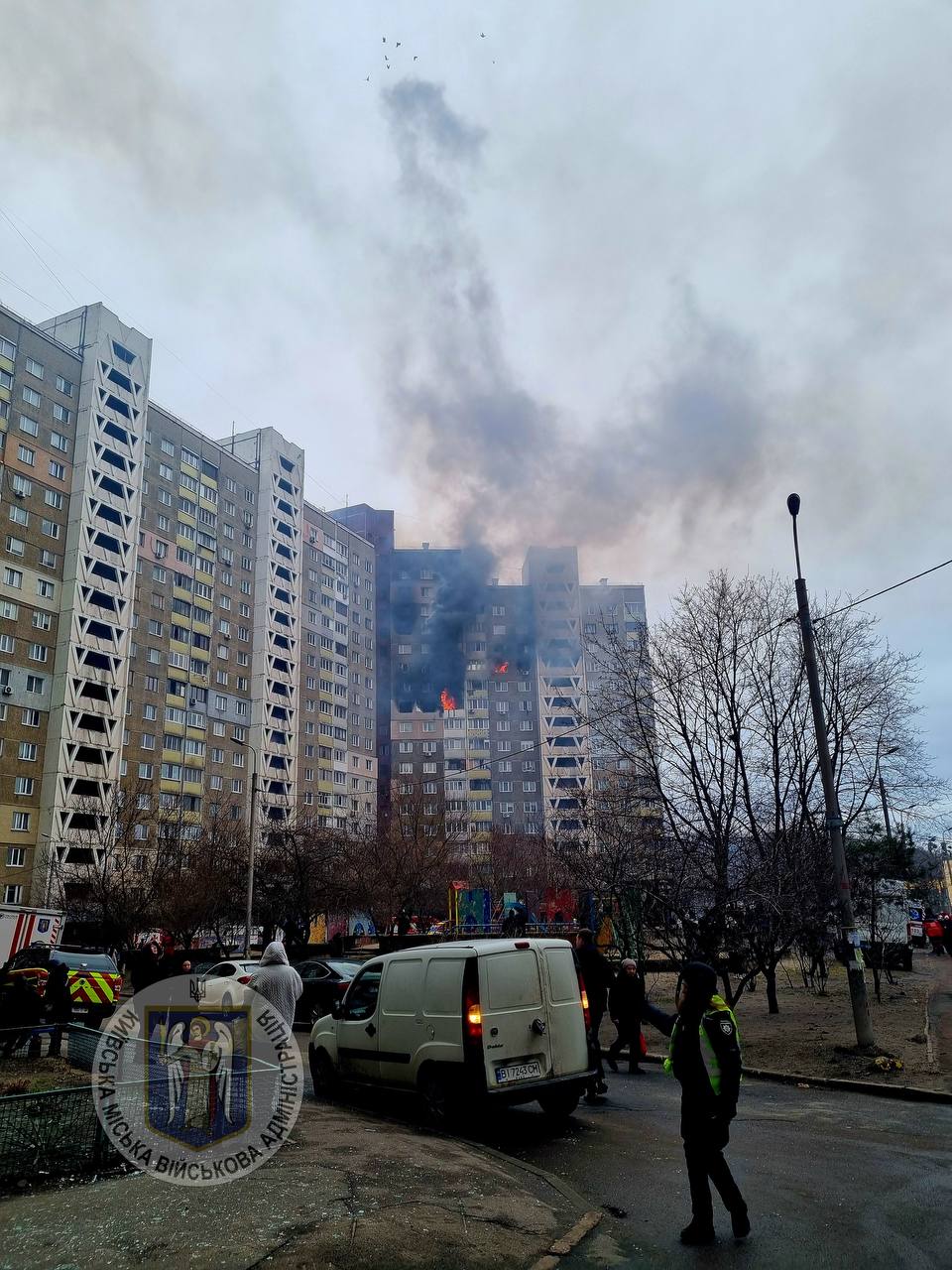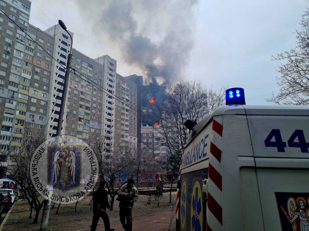 "В Голосіївському районі, з багатоповерхового житлового будинку, де сталася пожежа евакуйовано 52 людини, 8 — врятовано. 12 людей отримали травми. На місці продовжують працювати загони ДСНС.
