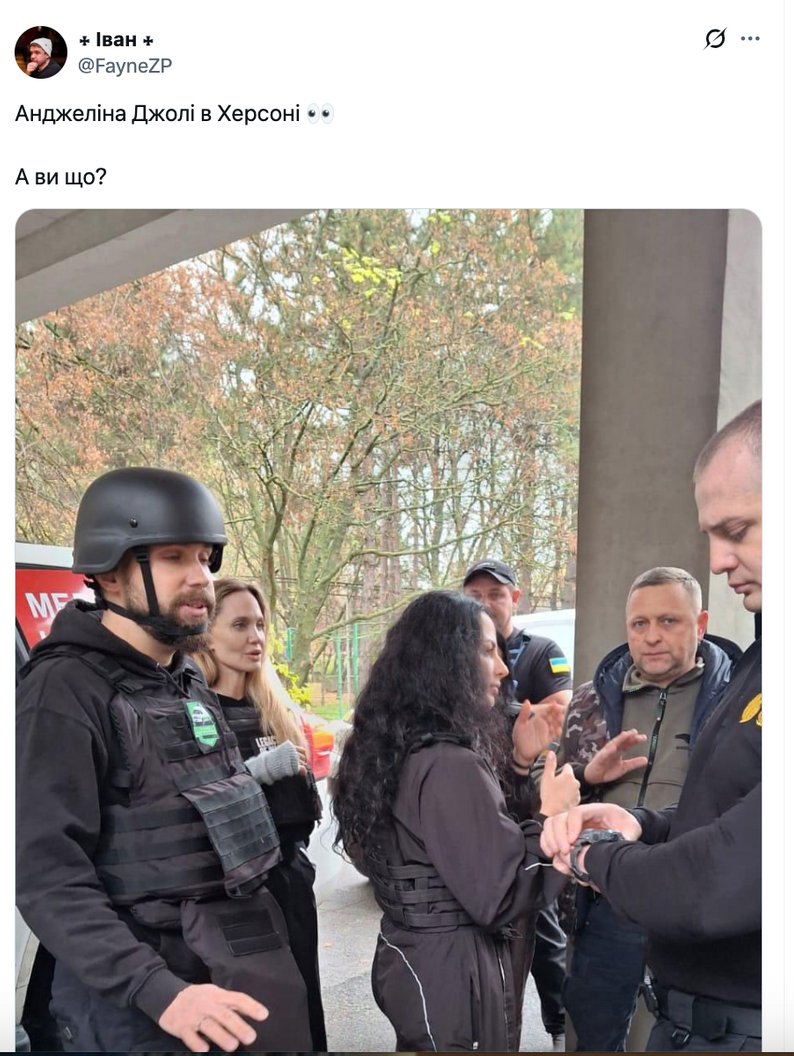 "У соцмережах з'явилися нові фото американської акторки Анджеліни Джолі в Україні — за повідомленнями, вона відвідала Херсон", - повідомляє 5 листопада "Суспільне".