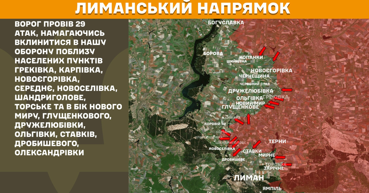 Як ідеться в оперативній інформації Генштабу ЗСУ станом на 8:00 28 листопада, на Лиманському напрямку ворог провів 29 атак, намагаючись вклинитися в нашу оборону поблизу населених пунктів Греківка, Карпівка, Новоєгорівка, Середнє, Новоселівка, Шандриголове, Торське та в бік Нового Миру, Глущенкового, Дружелюбівки, Ольгівки, Ставків, Дробишевого, Олександрівки.