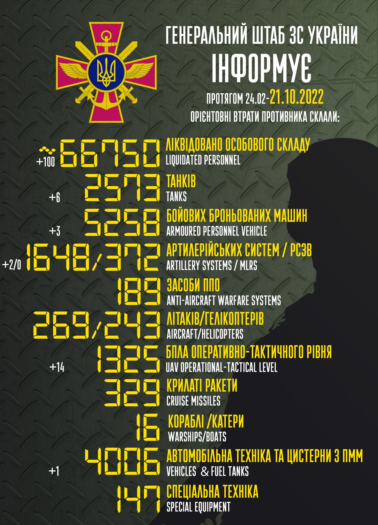 Підкреслюється, що загальні бойові втрати противника з 24 лютого по 21 жовтня орієнтовно склали: