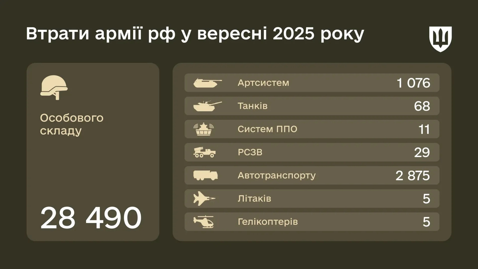 <p style="text-align: justify;">"Упродовж вересня російська армія втратила 28 490 військових. Це — умовно чисельність майже трьох мотострілецьких дивізій", - повідомляє Міноборони України.</p> <p style="text-align: justify;">За інформацією Генерального штабу ЗСУ, протягом вересня Сили оборони України також знищили або пошкодили 1 076 артилерійських систем ворога. Це – чисельність майже 60 артилерійських дивізіонів. Окрім того, упродовж першого місяця осені наші воїни уразили 5 ворожих літаків та 5 гелікоптерів", - зазначили у Міноборони України 3 жовтня.</p> <p style="text-align: justify;">У вересні Силами оборони України також було уражено 11 систем ППО російської армії, 68 танків, 29 РСЗВ та 2 875 одиниць автотранспорту.</p> <div class="article__content__img"><img class="" title="" src="/upload/media/2025/10/03/large-ru-losses-statistic-08-2025-site-01-4-757ed7dd39.jpeg" alt="" /></div>