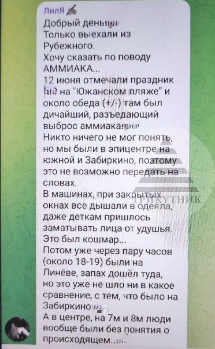"Рубіжне. Ось що пишуть сепари, які були в місті, коли смерділо аміаком", - написав "Трикутник", розмістивши скріншот повідомлень місцевих жителів.
