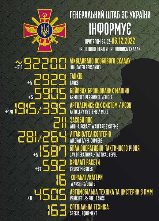 Загалом, з початку повномасштабного вторгнення до України, втрати рашистів складають 92 200 осіб.