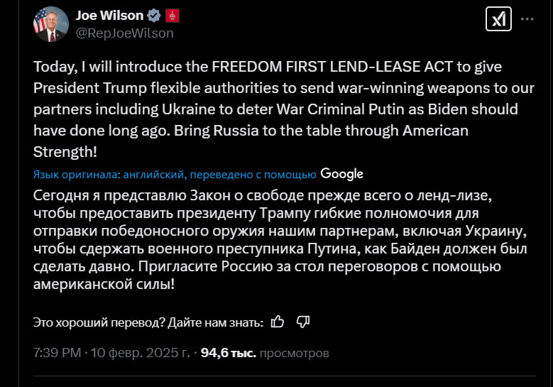 Про це в соцмережі Х написав конгресмен-республіканець Джо Вілсон 10 лютого.