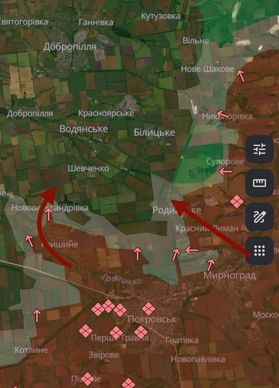 "Плюс купа невідомих жмурів під завалами, яких навіть вони ніколи не будуть відкопувати. Через це ворог посилює наступальні дії в напрямку н.п. Шевченко зі сторони Гришине, на півдні від Добропілля, щоб обрізати всю логістику та вийти в тил підрозділам СОУ, які тримають Родинське", - пише "Алекс".