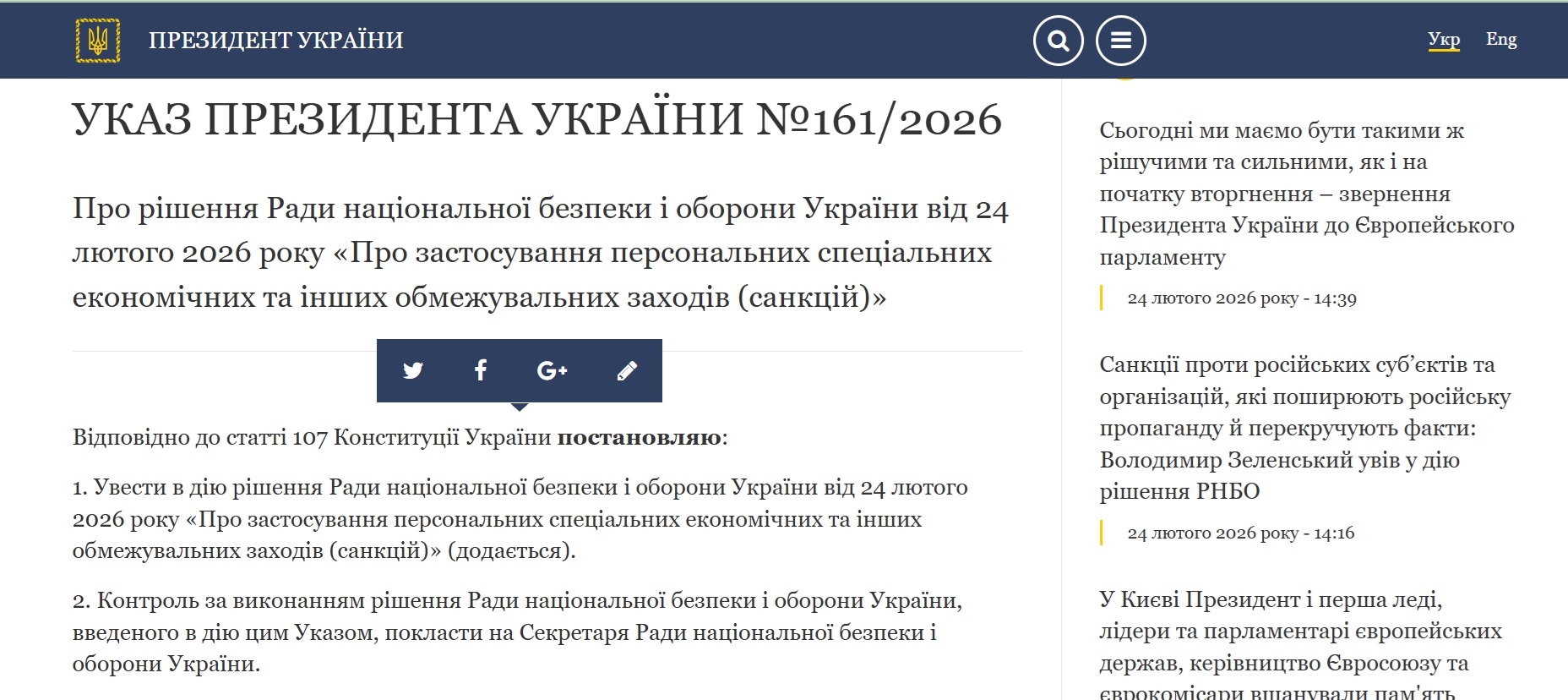 Прізвища й особисті дані тих, кроти кого запроваджено санкції - у додатках до рішення Ради національної безпеки і оборони України від 24 лютого 2026 року "Про застосування персональних спеціальних економічних та інших обмежувальних заходів (санкцій)".