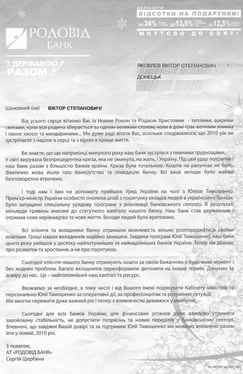 Отдельно прошу Генерального прокурора, Министра внутренних дел и Главу Национального банка Украины поручить провести проверку на предмет выяснения источника финансирования «поздравительных» писем Родовидбанка и законности использования этих финансовых средств.