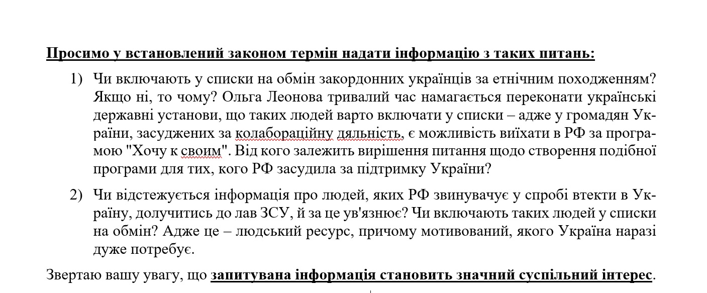 Отметим, что слова о приоритетности освобождения наших соотечественников из плена –  довольно общие. В ответе соблюдена этика и законодательство и в то же время полностью проигнорирован второй вопрос нашего запроса – отслеживается ли информация о людях, которых РФ обвиняет в попытке бежать в Украину, вступить в ряды ВСУ, и за это заключает в тюрьму? Включают ли таких людей в списки на обмен?