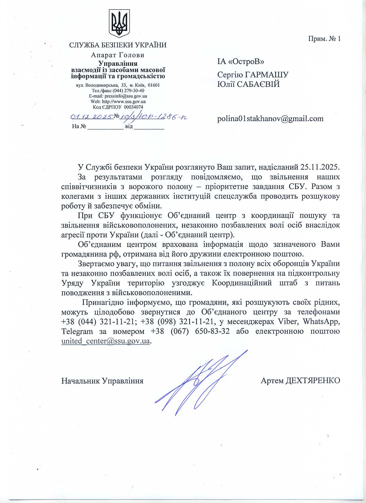 Приводим ответ "ОстроВу" от СБУ за подписью начальника Управления взаимодействия со средствами массовой информации и общественностью Артема Дехтяренко.