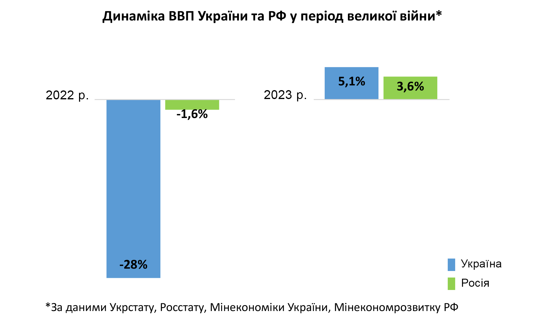 Инфографика показывает, что украинская экономика за первый год войны пострадала намного сильнее. Это связано с эффектом масштаба: не то чтобы российская была мощнее (более 60% ее доходов приходится на экспорт энергоресурсов, какая уж тут мощь). Она просто больше. Поэтому устойчивее к любым кризисам. Другими словами, во время шторма маленькой лодке гораздо проще утонуть, чем большому танкеру. Даже если на нем установлены паровые двигатели начала прошлого столетия.