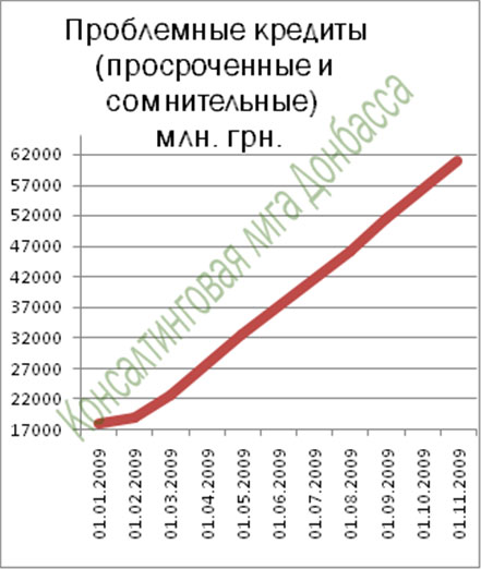 Простой расчет показывает, что Проблемная задолженность/Выданные кредиты 60’882’000’000 грн./751’120’000’000 грн.* 100% = 8% (на самом деле, по оценкам экспертов, 23-27%). Казалось бы, 8% - еще терпимо, критическим для деятельности банка является отношение 30%, т.е. 225’336’000’000 грн. Да! Но давайте взглянем на темпы роста. За 10 месяцев 2009 года рост задолженности случился от 18’015’000’000 грн. до 60’882’000’000 грн., что составляет 338% или 33,8% в месяц! Следовательно, если верить официальной статистике и строить прогноз, основываясь на ее данных, то такими темпами, господа, мы придем к дефолту банковской системы аккурат через 11 месяцев, т.е. к 1 октября 2010 года (думаю, что реально это случится уже в апреле 2010года). Я уже умалчиваю о том, что дефолта одного-двух крупных банков хватит, чтобы вызвать цепную реакцию (вспомним истерики вкладчиков и отток средств из банковской системы в целом, когда «шатался» Проминвестбанк).