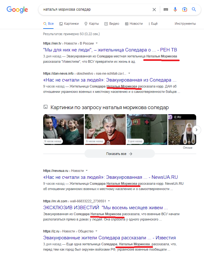 Одна из жительниц вообще стала звездой не только сепаратистских, но и российских центральных средств массовой дезинформации. Некая Наталья Морикова направо и налево раздавала комментарии о том, какие плохие украинские военнослужащие и какие замечательные русские: "Это украинцы. Они разгромили наш полностью Соледар. Это их рук дело. Они били по домам. Танк ночью ездил, бил. Этот грохот в ушах, наверное, долго будет стоять. Это страшное дело…".