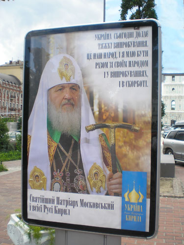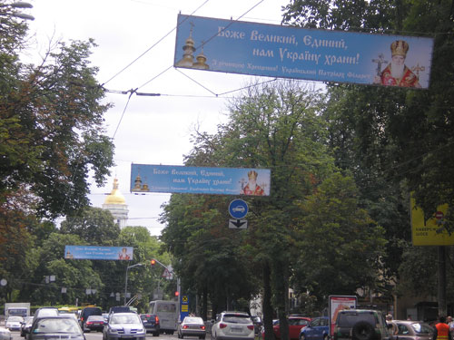А между тем над улицей Ивана Мазепы, ведущей к ним обеим, к приезду Патриарха Кирилла появились баннеры с изображением Патриарха Филарета и с поздравлением с крещением Руси. Встречающим высокого московского гостя они напоминали, что Украинский Патриарх – Филарет (см фото).