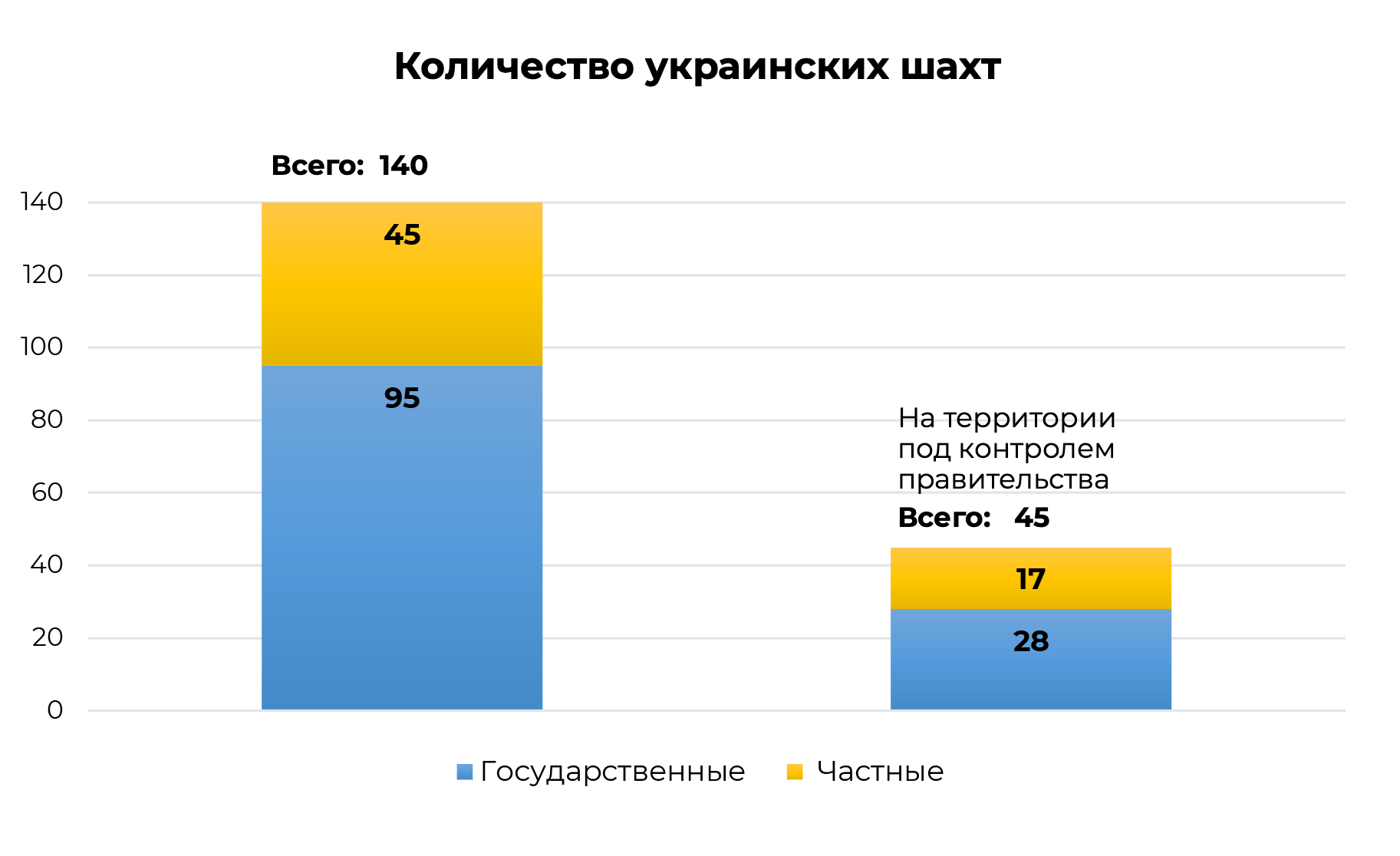 По состоянию на конец 2020 года украинское правительство управляло 28 шахтами, еще 17 находились в частных руках. Уровень угледобычи и на государственных, и на частных шахтах стабильно падает. По результатам кризисного 2020 года госшахты не смогли оправдать даже скромного прогноза в 3,1 млн тонн.