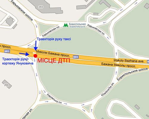 Аварія сталася на Харківській площі. Кортеж на великій швидкості рухався по проспекту Бажана до Борисполя, звідки Янукович мав вилетіти до Харкова на зустріч з російським президентом Медведєвим.