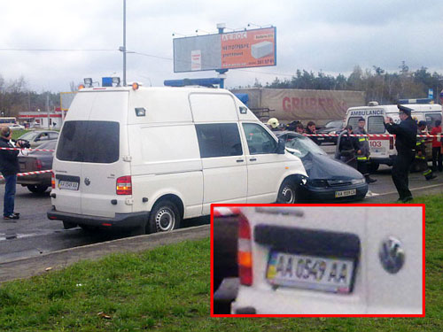 Четверте. Номер швидкої допомоги, яка потрапила в ДТП, АА 0549 АА, значиться у базі ДАІ за Клінічною лікарнею Державного управління справами. Як відомо, Державне управління справами - це орган адміністрації президента, до відання якого також входять і спеціальні медичні заклади, що обслуговують перших осіб держави.