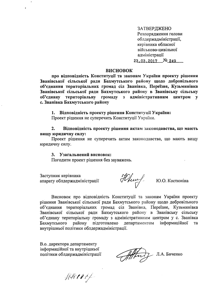 Чем не удовлетворил зажиточные бахмутские села существующий перспективный план областной администрации? "Вы видели Северск? — Спрашивает сельский глава Звановки. — Нет? Поезжайте, посмотрите. Мрачный, вымирающий город. Единственное градообразующее предприятие — доломитный комбинат. Сегодня от этого доломитного комбината осталось только две трубы. У нас нет ничего общего".