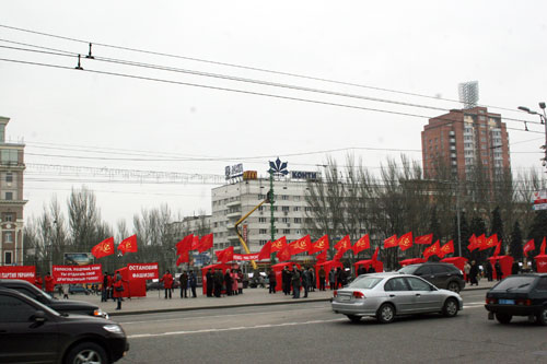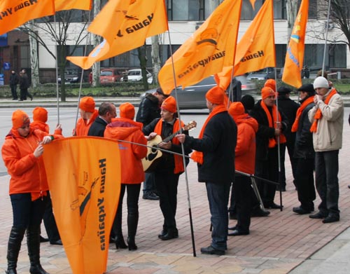 Сегодня в Донецк приезжал Президент Украины Виктор Ющенко. Об этом событии наблюдательные жители столицы Донбасса могли догадаться по большому количеству на улицах города сотрудников милиции, которые ограничивали движение по центральным улицам не только автомобильного транспорта, но и пешеходов. Так корреспондент "ОстроВ" при попытке пройти мимо музыкально-драматического театра, в котором часа через два должен был появиться Виктор Ющенко, был остановлен человеком в штатском. Тот попросил показать журналистское удостоверение и посоветовал избрать для себя иной маршрут передвижения. А вот для того, чтобы попасть на встречу с президентом в Донецкую областную государственную администрацию, одной журналистской карточки было недостаточно. Кто-то наверху напутал с аккредитацией представителей СМИ, в результате чего некоторых журналистов в госадминистрацию не пустили. Особо настойчивых выгоняли взашей, не стеснясь при этом применять силу даже к женщинам. Напрасно один из лишенных права посмотреть на Виктора Ющенко корреспондентов кричал невозмутимо спокойной охране: "Пропустить мене! Це мій Президент". Вообще простых людей к зданию ОГА не пропускали. Люди в штатском останавливали всех прохожих метров за 200 до входа в Белый дом. Проход в запретную зону был открыт лишь сторонникам Виктора Андреевича. Но не всем, а лишь тем, кто вошел в организованную "группу поддержки". Их привезли на заказных автобусах с надписью на лобовом стекле "Нерегулярные перевозки". Некоторые автобусы подъезжали в сопровождении мигалок ГАИ. Прежде всего, симпатики главы государства установили оранжевую агитационную палатку. Из нее начали раздавать оранжевые знамена "Нашей Украины", оранжевые шапочки и оранжевые транспаранты с надписью "Донецк за Ющенко", "Макеевка за Ющенко", «Мариуполь за Ющенко» и так далее. Получив партийную атрибутику, участники встречи президента не спешили вставать в общий строй, а, ссылаясь на холод, отходили к ближайшим киоскам "погреться". Возвращались они заметно повеселевшие, однако, всех вышедших за охраняемый периметр обратно к парадному подъезду не пропускали. Приходилось звать некоего Николая Борисовича, который подтверждал стоявшим в оцеплении секьюрити, что отбившиеся от группы поддержки действительно включены в список официально встречающих. Кроме активистов "Нашей Украины" посмотреть на Виктора Ющенко вблизи были допущены казаки. В папахах и с лампасами. У некоторых поверх армейских шинелей с погонами были наброшены оранжевые шарфики, другим этого атрибута революционного майдана просто не хватило. "Вот, каким-то колхозникам раздали, а нам нет", - обиделись казаки. Наконец, приехал Виктор Андреевич. Казаки встали по стойке "смирно", штатские "нашеукраинцы" весьма недружно начали скандировать "Ющенко! Ющенко" и размахивать оранжевыми флагами. Президент не стал обходить нестройные ряды своих соратников и, ограничившись приветственным взмахом руки, скрылся за дверью областной администрации. Руководитель Донецкой городской организации НУ Сергей Зикеев сразу после этого скомандовал всем построиться в колону "по четыре" и перемеситься к зданию Донецкого музыкально-драматического театра, где уже ожидали немногочисленные сторонники Ющенко, которые согревались танцами и песнями под гитару. Площадь возле госадми