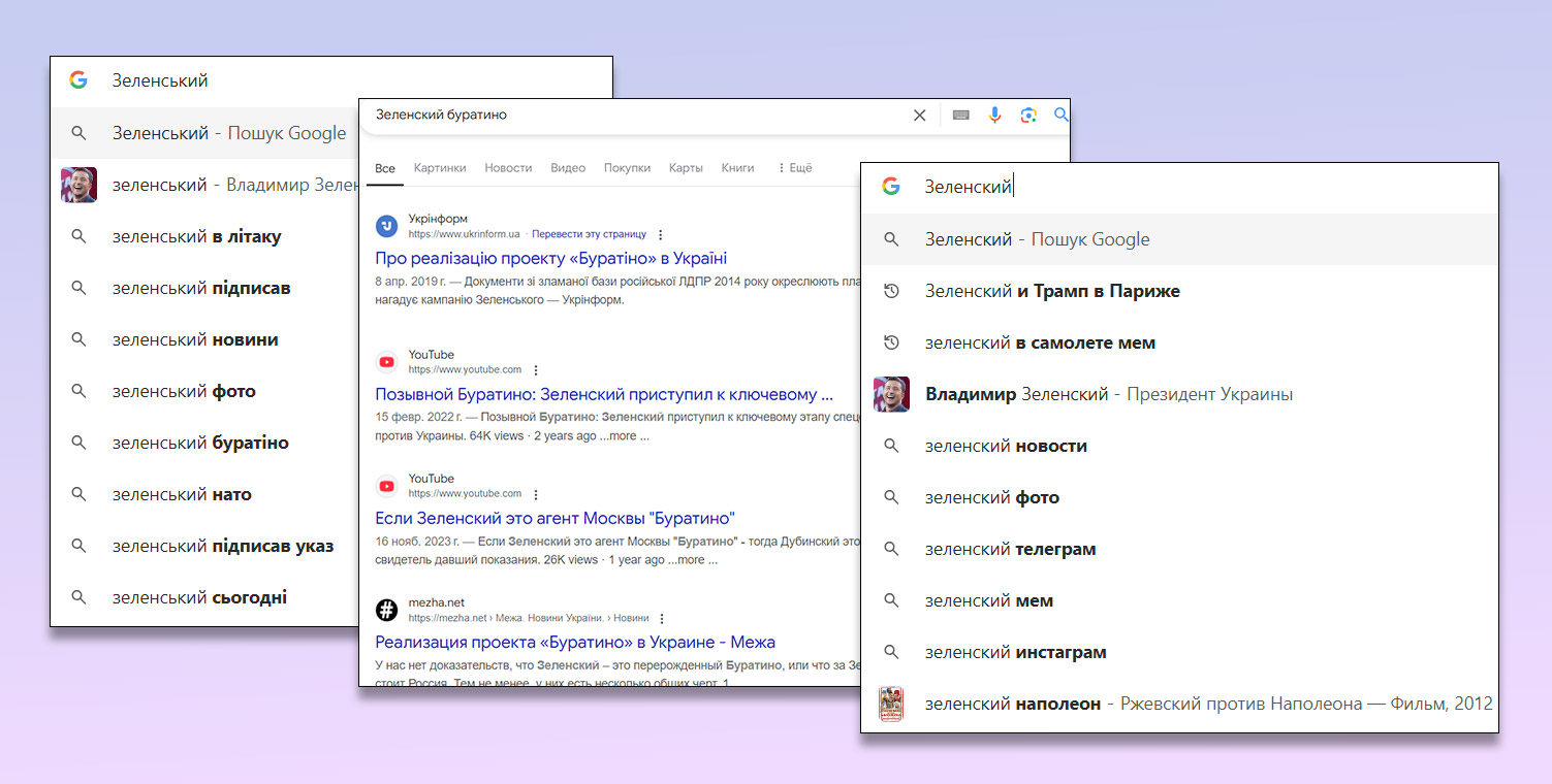 В частности, я забивал в поисковик фамилию или комбинацию слов с этой фамилией и смотрел какие варианты продолжения запроса выдаст поисковик. Известно, что он выдает наиболее популярные варианты запросов на данный момент. Для большей релевантности запросы делались на украинском и русском языках.