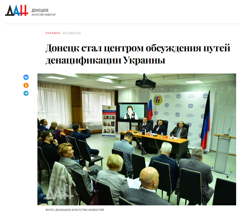 Итак, местные Z-журналисты радостно сообщили, что "В Донецке началась Всероссийская научная конференция "Денацификация: история и современность". Она открылась в Донецком государственном университете и проходит третий раз". Якобы в ней приняли участие более 200 ученых. Никаких ярких имен современных мыслителей заявлено не было, поэтому донецкой пропаганде пришлось довольствоваться цитированием доцентов и профессоров провинциальных российских вузов, а также местных "историков" и "политологов".