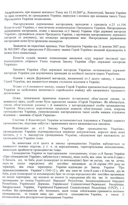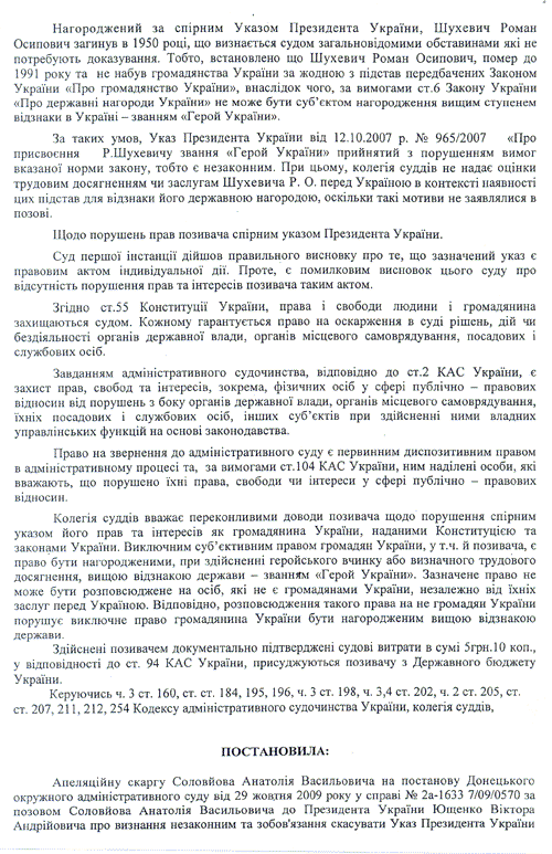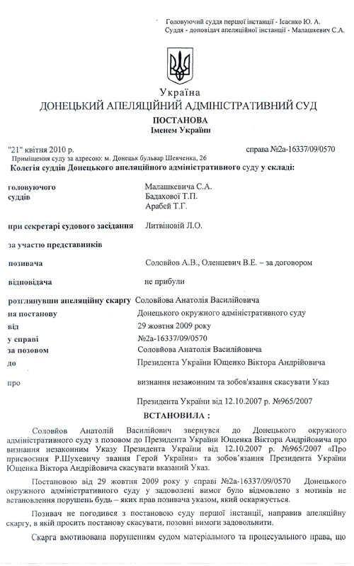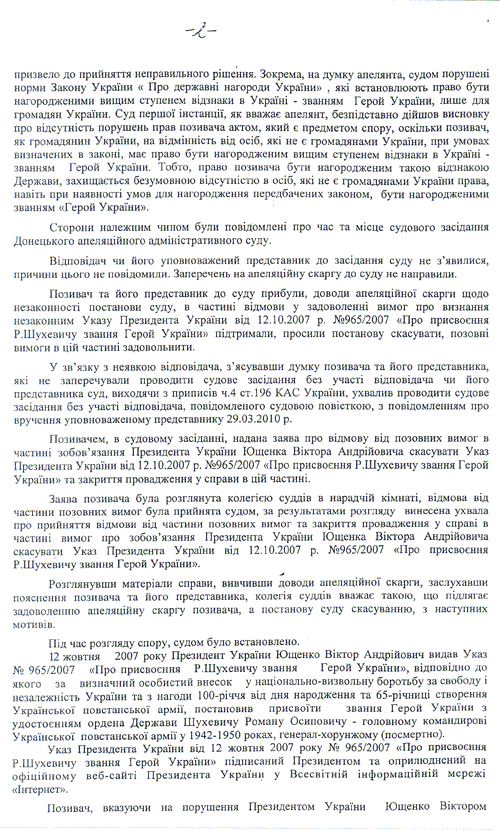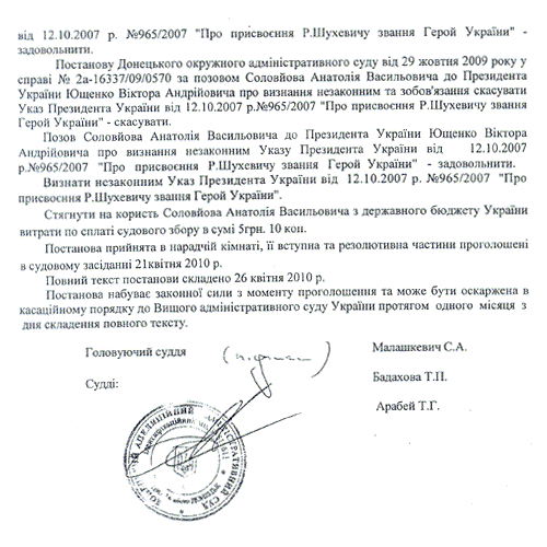 Донецкий Апелляционный административный суд подготовил полный текст решения суда от 21 апреля 2010 года о признании незаконным Указа Президента Украины Виктора Ющенко от 12 октября 2007 года о присвоении звания "Героя Украины" главнокомандующему Украинской Повстанческой Армии (УПА) Роману Шухевичу (посмертно).