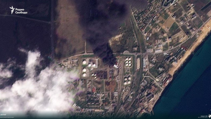 Пожар на нефтебазе в Феодосии продолжается вторые сутки. На спутниковом снимке видно, что дым растянулся на 12 километров