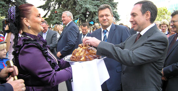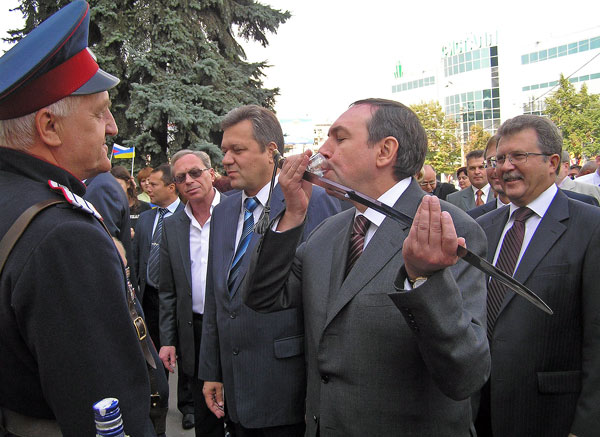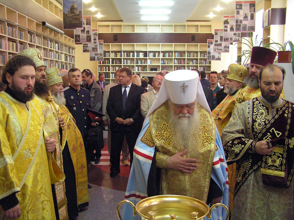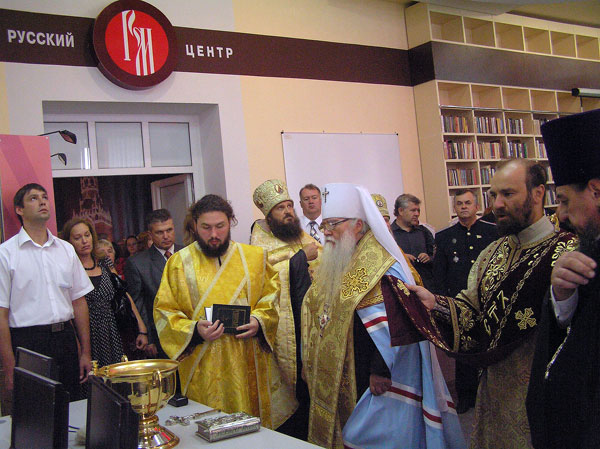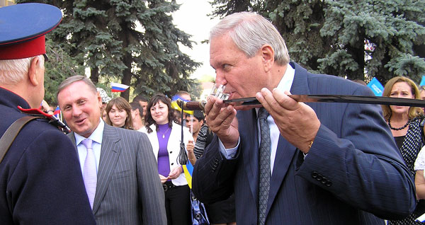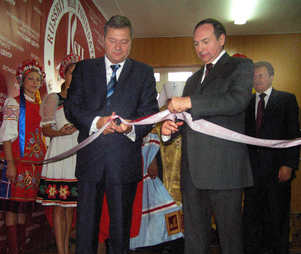 32-й «Русский центр» в мире, и 2-й в Украине открыт сегодня в Луганске, в областной библиотеке им. Горького, передает корреспондент «ОстроВ». Как сообщал «ОстроВ» ранее, открытие центра – инициатива Луганского облсовета и благотворительного фонда «Русский мир». По мнению исполнительного директора фонда «Русский мир» Вячеслава Никонова, между Украиной и Россией существует «много общего и неразрывного». «Для нас невозможно разделить Владимира Даля, Николая Гоголя. Даже Тарас Шевченко писал свои стихи на украинском языке, а прозу и дневники – на русском. Мы не можем разделить «Молодую Гвардию» - имена молодогвардейцев напоминают о наших общих идеалах в борьбе с фашизмом», - подчеркнул он. Непосредственно презентация проходила «с русским размахом»: еще у входа донские казаки, по старинному обычаю, предлагали гостям стопку водки с шашки. Играл ансамбль струнных инструментов, состоящий из музыкантов симфонического оркестра Луганской областной филармонии. Митрополит Луганский и Алчевский Иоанникий отслужил молебен и провел чин освящения «Русского центра». На событии присутствовали как представители местного политбомонда, так и российские дипломаты и деятели культуры. Несмотря на то, что «Русский центр» по своей сути задуман как один из отделов библиотеки (расположился в бывшем «шевченковском» зале, где ранее находился памятник Т. Шевченко, сейчас перенесенный в другой зал библиотеки), многие из выступавших на открытии наделили его не только культурными, но и политическими функциями: «Русский центр» также призван не дать дистанцироваться двум родственным народам, российскому и украинскому», - сказал Генеральный консул РФ в г. Харьков Всеволод Филипп. По его мнению, центр «вынужден выполнять особенно важную миссию» - содействовать укреплению связей между Россией и Украиной. «Русский центр открывает для луганчан, особенно для молодежи, большие перспективы – прежде всего, общения с громадным пластом мировой цивилизации, которым является русская культура», - подчеркнул В. Филипп. Перед началом царемонии нардеп А. Ефремов звонил какой-то, видимо, очень важной персоне или по какому-то очень важному делу. Даже российских гостей приветствовал, не прерывая разговора. Хлеб-соль... Как же без них? И по-казачьи - стопка водки с шашки. Нардепа Тихонова тоже не обделили "Русский центр" открыт! И освящен. После открытия "Русского центра" Луганская областная билиотека им. Горького стала библиотекой контрастов. На одном этаже с "Центром" расположен такой вот зал периодической литературы.