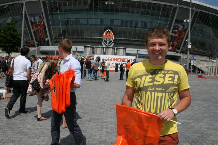 Ровно в 12 часов на стадионе включили "гудок мира", который звучит из динамиков. Участники акции машут оранжевыми флажками с логотипом клуба и надписью "Вперед, "Шахтер".