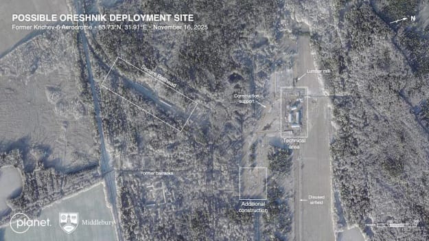 Джеффри Льюис из Института международных исследований Мидлбери в Калифорнии и Декер Эвелет из исследовательской и аналитической организации CNA в Вирджинии выявили потенциальное размещение “Орёшника” по снимкам коммерческой спутниковой компании Planet Labs.