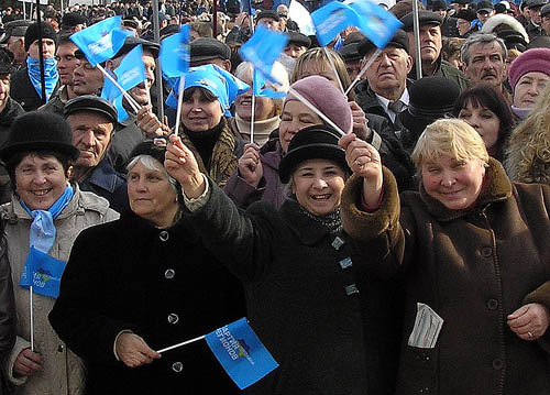 Площадь была заполнена голубыми (ПР), красными (КПУ и ПСПУ ), малиновыми (СПУ), белыми ( общественная организация «Молодая гвардия») флагами в руках представителей партий из Луганска, Краснодона, Алчевска, Стаханова, Северодонецка, Первомайска, Антрацита, Перевальска, Брянки, Кировска, Красного Луча и т.д.