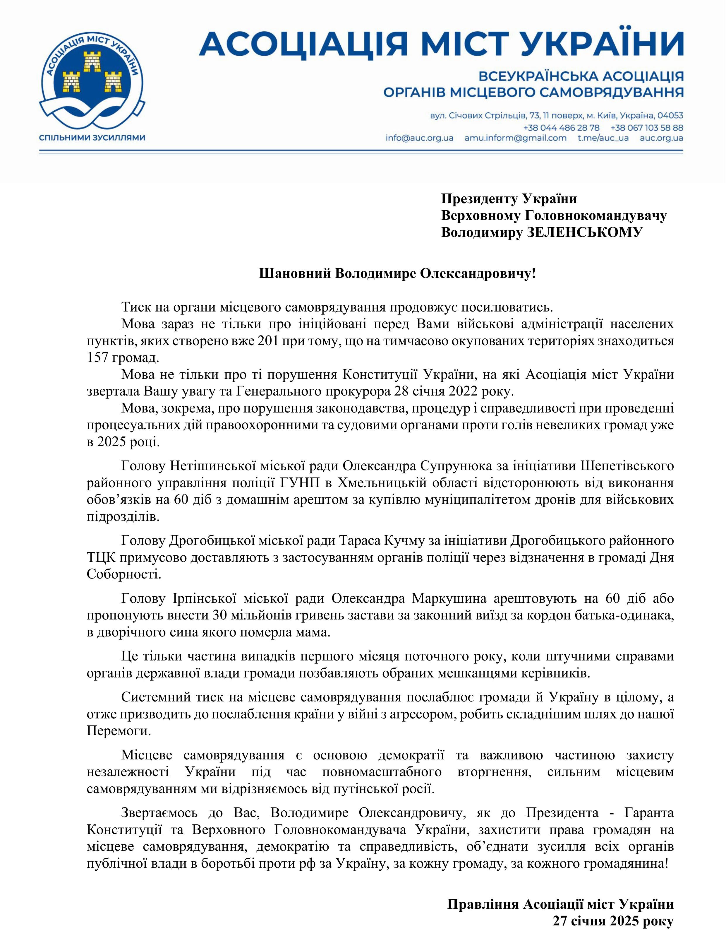 Ассоциация городов Украины приводит примеры давления на глав небольших общин уже в январе 2025 года и отмечает о предыдущих обращениях о нарушении законодательства, процедур и справедливости при проведении процессуальных действий правоохранительными и судебными органами в отношении представителей местного самоуправления.