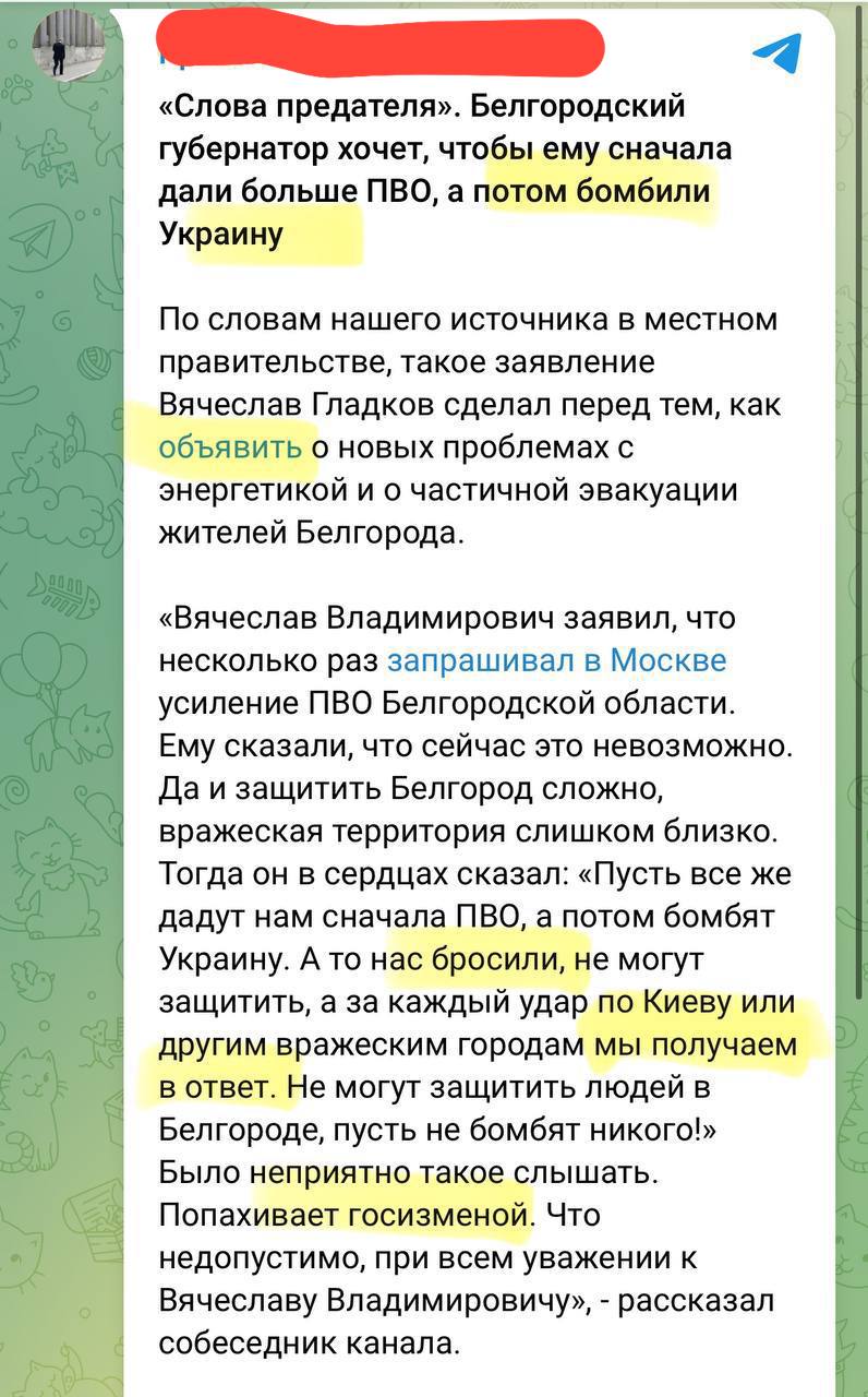 "Интересная инфа приходит из Белгородской области. Очевидно, что давление Киева на прифронтовые области дает свой результат. Я абсолютно не удивлен тому, что кремлевские интеллектуалы записали губернатора области в предатели. Интересно, сколько еще будет таких представителей "элиты", которые, мягко говоря, устали от продолжения боевых действий", - пишет Телеграм-канал "Соловьиный Помёт" 9 февраля, разместив скрин соответствуюшего сообщения.