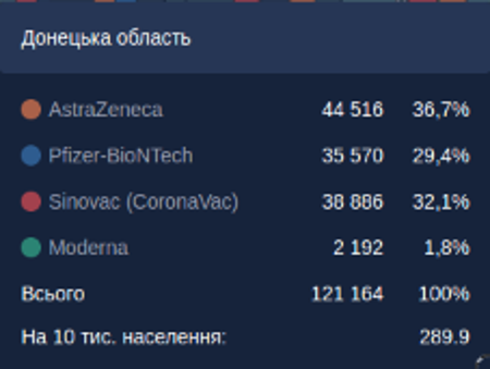 Отмечается, что с начала прививочной кампании первую дозу вакцины на Донетчине получили 185 173 человека, а 121 164 лицам вкололи две дозы.