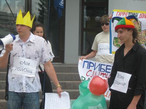 В театрализованном действии активисты показали, как местная власть заботится о красоте только в той части Донецка, которую видно из их кабинетов, а также то, как шахтерская столица из "города миллиона роз" превратилась "в город миллиона мусорников", и в этом "виновным признан мэр Донецка и секретарь горсовета".
