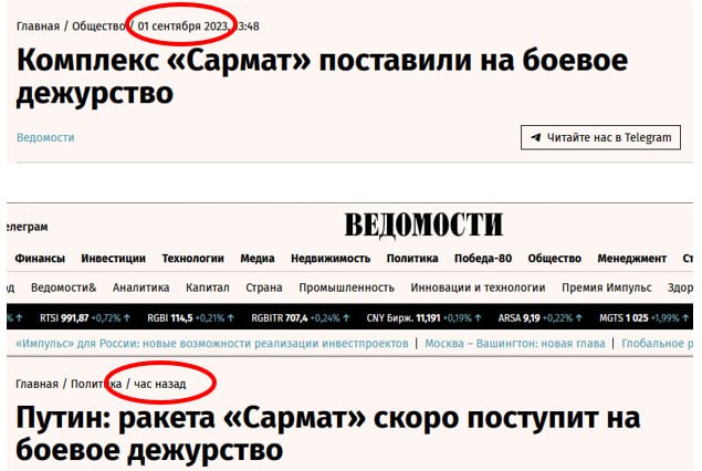 "Президент России Владимир Путин сообщил, что новая межконтинентальная баллистическая ракета «Сармат» в ближайшее время поступит на боевое дежурство", - сообщают 29 октября росСМИ. При этом российские паблики напомнили, что о постановке на боевое дежурство ракеты сообщалось два года назад. "Два года назад Россия официально заявила, что «Сармат» встал на боевое дежурство. Сегодня Путин заявил, что «Сармата» на дежурстве до сих пор нет", - констатируют роспаблики. Как сообщалось, росСМИ вслед за путиным хвалятся субмариной "Судного дня": "Никого не останется, а «Посейдон» будет плыть".