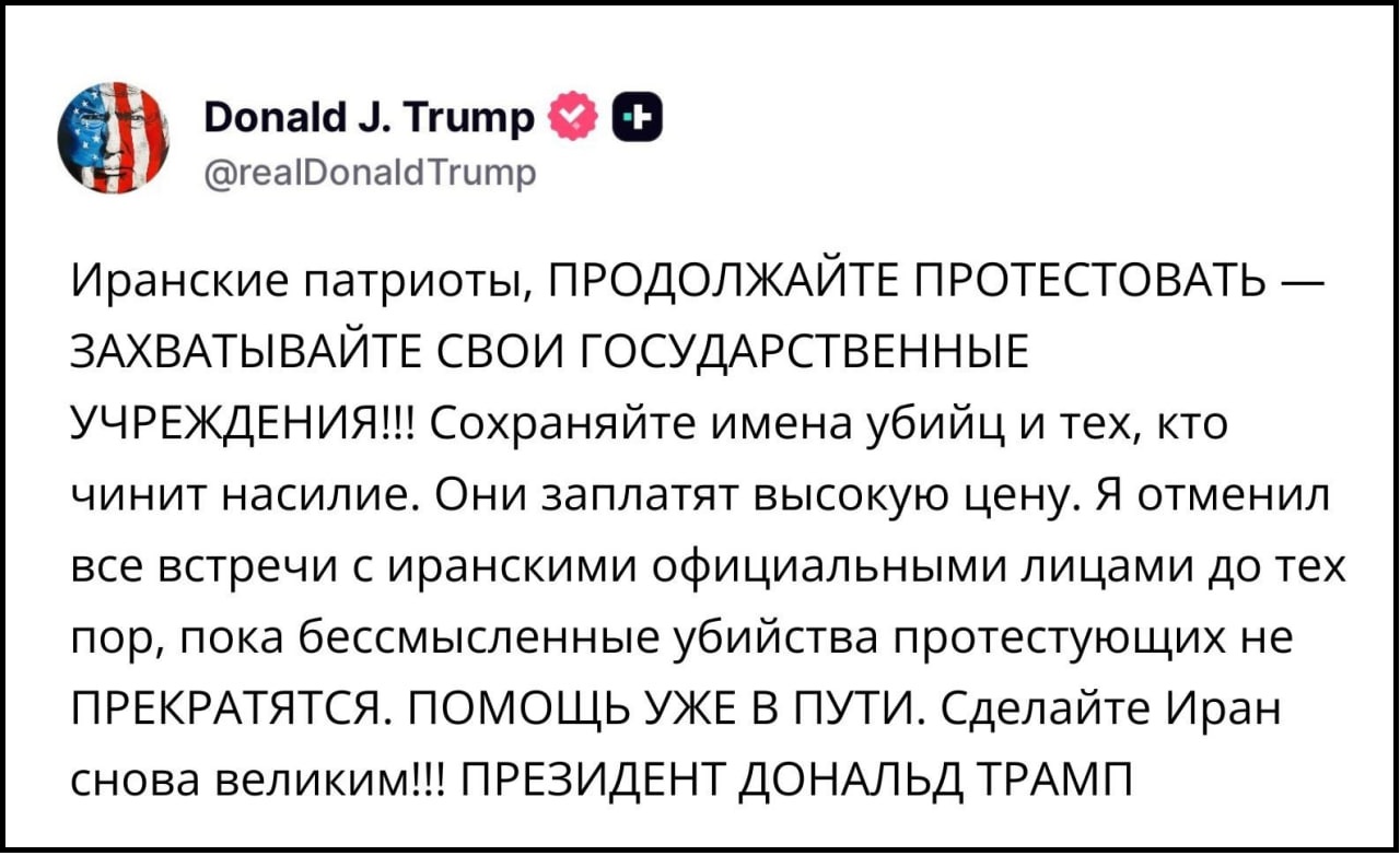 Официальный русскоязычный Телеграм-аккаунт Госдепартамента США "США по-русски" опубликовал 13 января скриншот обращения Дональда Трампа к протестующим в Иране.