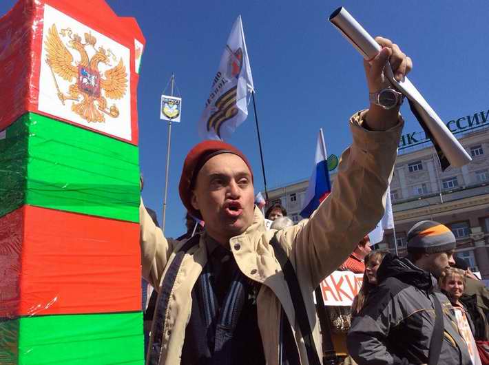 Как всегда участники митинга скандируют пророссийские лозунги и держат в руках флаги Российской Федерации, Георгиевские флаги и флаги пророссийских общественных организаций, включая запрещенную "Донецкую республику".